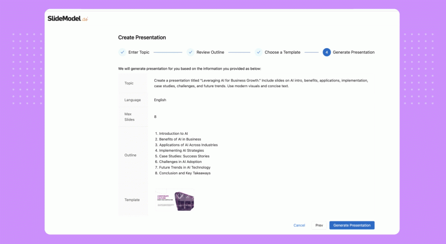Home PowerPoint Templates Communicate Ideas with SlideModel AI Corporate AI Presentation Maker 05-checking-outline-and-template-prior-to-ai-presentation-generation