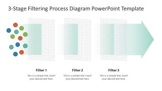 This 3-Stage Filtering Process PowerPoint Template shows a horizontal diagram with three square-shaped net filters in a line. Small arrows are shown passing through them to indicate the flow. Before each filter, there are small circular dots in multi-colors. For instance, there are dots in three colors before the first filter. This number of color variations is reduced to two after the second filter and remains only one after the last filter. This representation means a continuous selection process after each filter. The first slide of this PowerPoint template carries a fully colored diagram; however, the following slides only highlight a single stage of the process. It can help presenters discuss each filter and its significance in detail. Further, these slides provide editable text boxes to mention relevant points. So, grab this customizable 3-stage filtering diagram for your professional and academic presentations now!