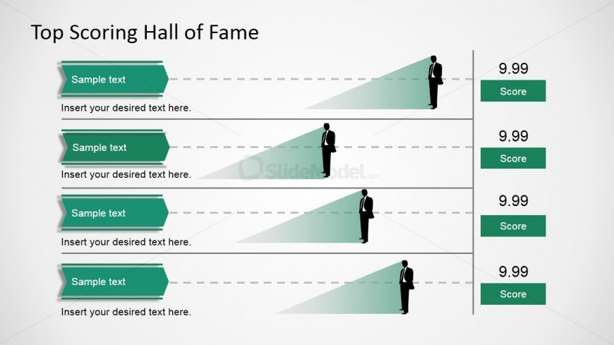 The Infographic Featuring Business Man SIlhouette for PowerPoint is a slide design presenting a professional table layout for scoring. In the left side of the table, the user can replace the text placeholders with a KPI name. The arrows are created as PowerPoint shapes and its effects are created with PowerPoint shadows and transparency. Indicating the value of each indicator, a business man silhouette is used as the pointing arrow. In the right side of the table, the numeric score y placed. The shadow effects of the indicators is created with a gradient triangle.