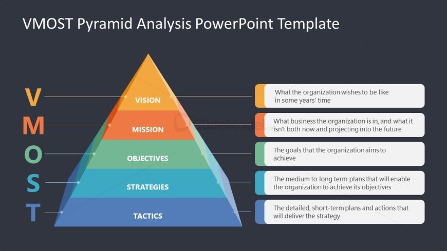 Home PowerPoint Templates Models VMOST Pyramid PowerPoint Template VMOST Pyramid Template Slide with Dark Background
